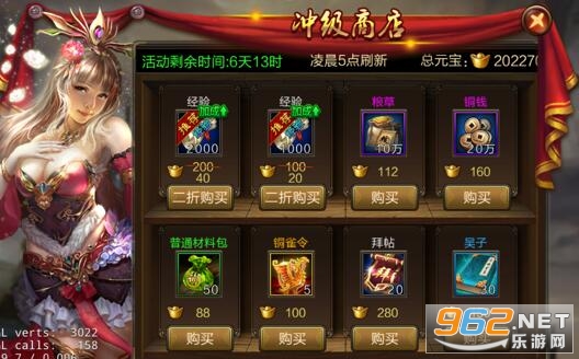建立角色前7日,每日均会开放一个冲级商店,在商店中除了能买到铜钱粮草等游戏资源外,还可以超低价值购买2份经验值。