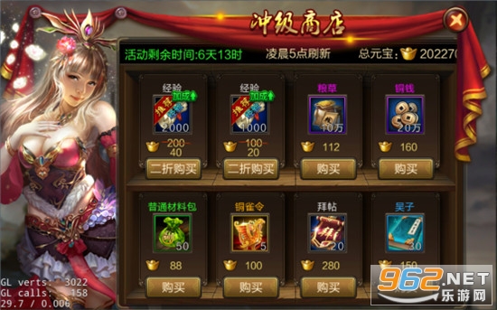 建立角色前7日,每日均会开放一个冲级商店,在商店中除了能买到铜钱粮草等游戏资源外,还可以超低价值购买2份经验值。推荐星数:★★★★