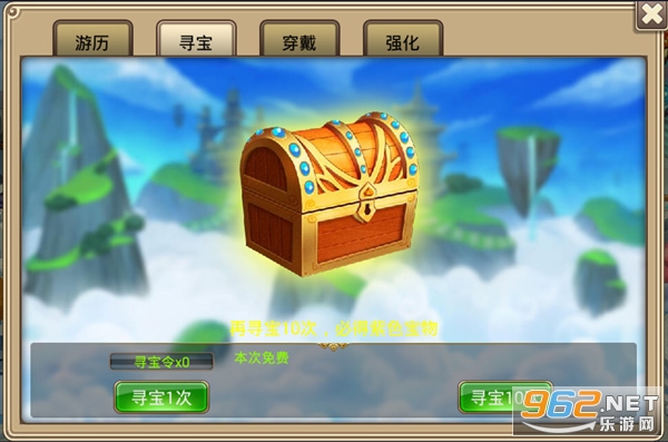 4、寻宝:分寻宝1次和寻宝10次,寻宝会消耗寻宝令,或者可以消耗250元宝,而且每48个小时会免费给玩家寻宝一次,寻宝10次后必得紫色宝物。寻宝10次是方便玩家多次寻宝,快速找到自己需要神兵和法宝