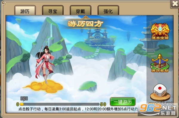 1、游历:玩家可以操作骰子,每点一次,玩家就跟着骰子的点数移动,游历会碰到各种有趣的事件,有的会送法宝、有的会送神兵、有的会送行动力,当然也有什么事情都没有发生的事件。行动力是游历必须消耗的资源,每个小时可以恢复一点,每天凌晨3点玩家会返回起点,在12:00和20:00会额外增加5点行动力。