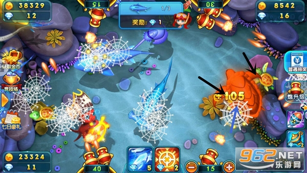 攻打大鱼能获得更多金币和钻石奖励,但同时也需要消耗更多的金钻,如大白鲨、大金鲨、大海怪等。还要注意的是,如果大鱼还没游到你面前,你使劲拼命进攻也是捕捉不到的,还浪费金币。