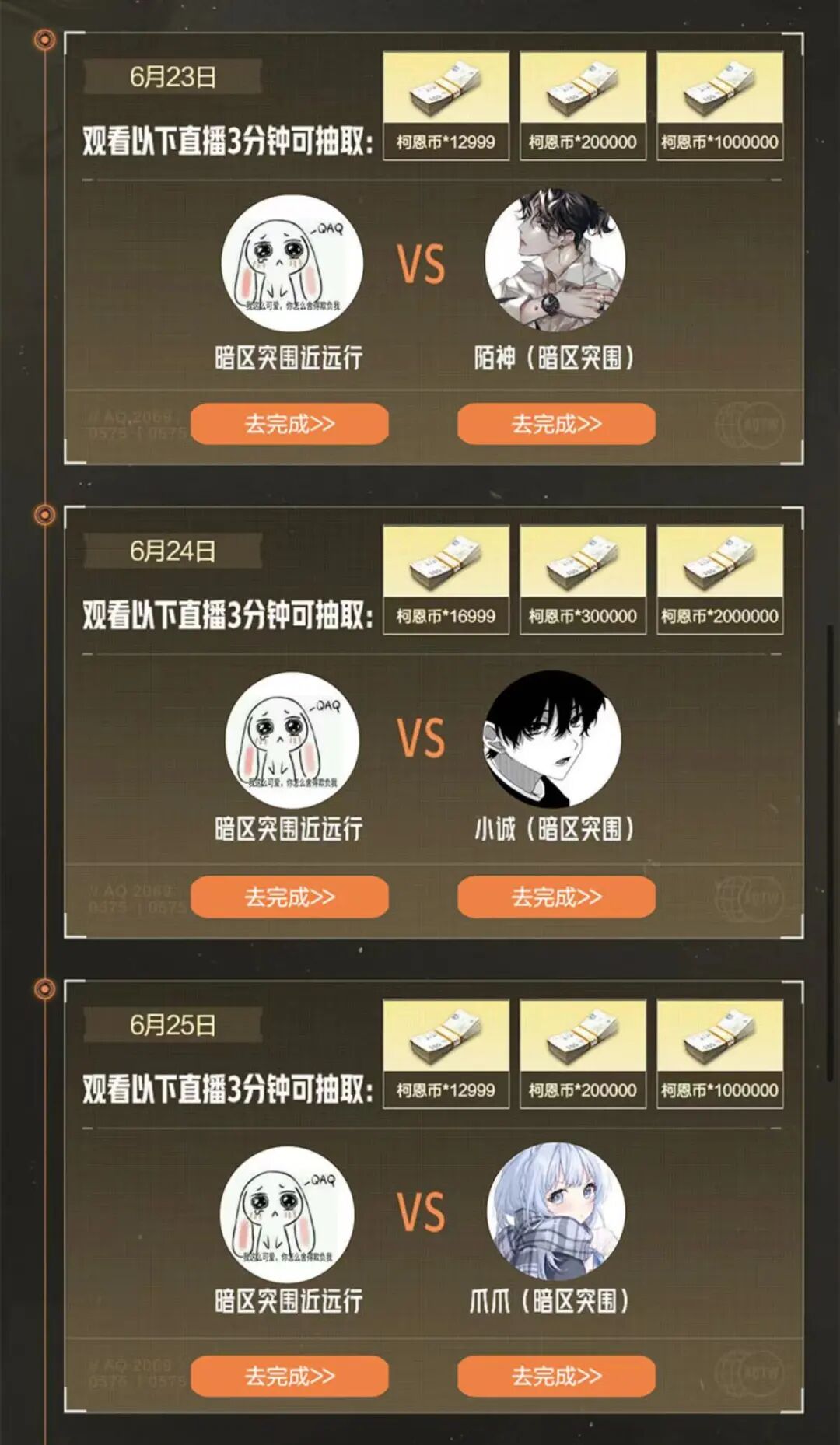 在6月23日的挑战直播中,先锋们观看直播有机会抽取柯恩币*12999、柯恩币*20万、柯恩币*100万;
