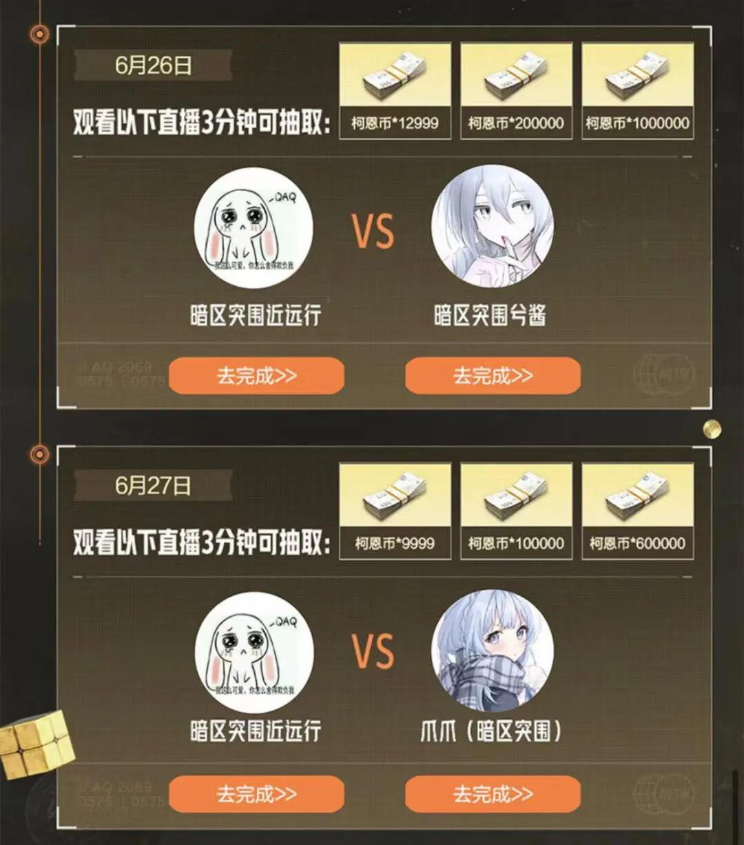 在6月27日的挑战直播中,先锋们有机会抽取柯恩币*9999、柯恩币*10万、柯恩币*60万!