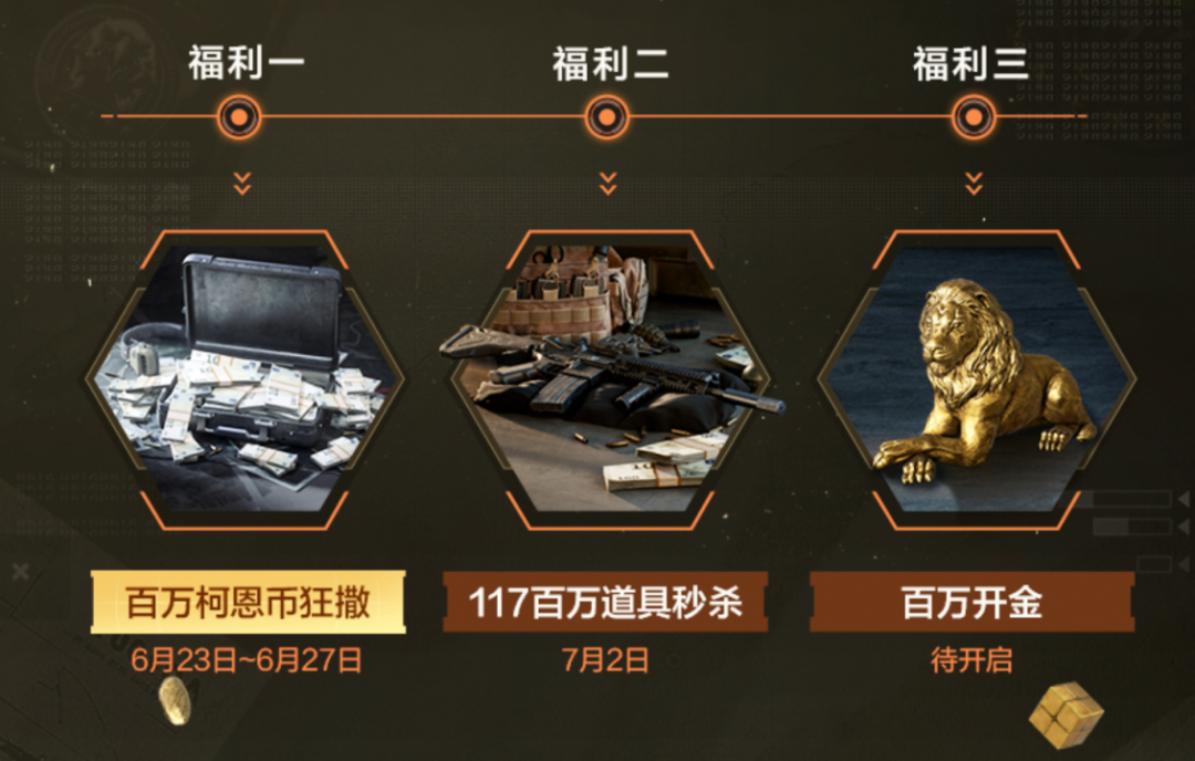 福星主播玩遍专区,每日整活挑战物资上限。作为暗区知名主播,也是暗区一周年的福星代表,近远行将在6月23日~6月27日每晚19点~22点开启第一阶段的福利活动,每日狂撒百万柯恩币!在本阶段的活动期间,近远行将会每天迎战一名主播,共持续五天。先锋每天仅需观看“福星”直播3分钟以上,即可领取柯恩币,并能够参与柯恩币抽奖。