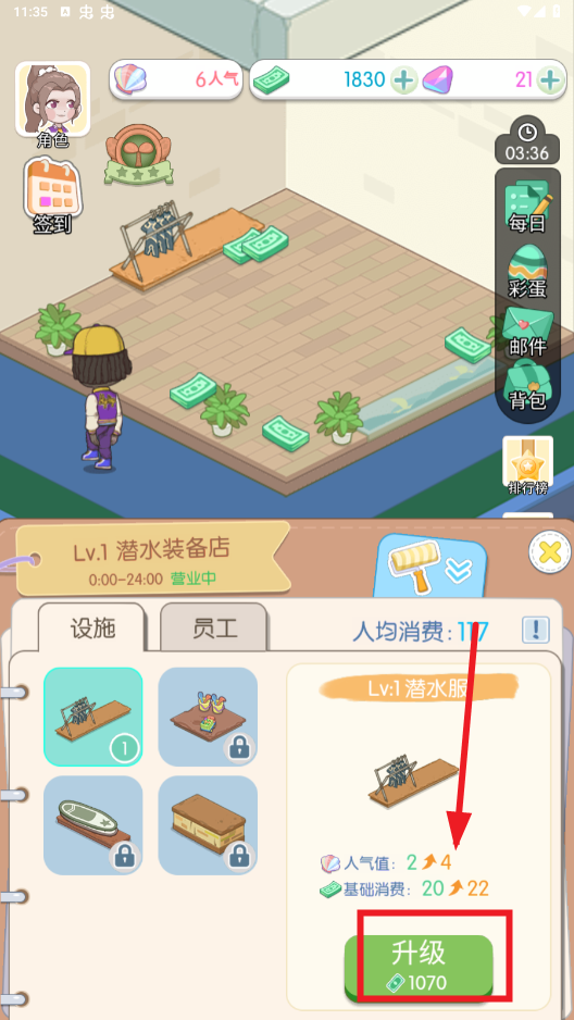 不断地点击任务,并完成,领取奖励,升级自己的小店