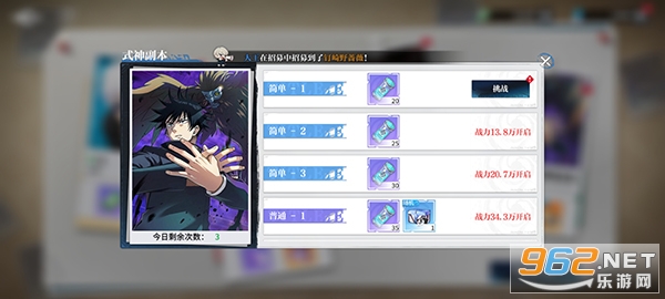 3、随着你的战力不断提升,在式神副本中挑战更高级的难度副本,可以获得更高品质的式神碎片,每天挑战的次数记得一定要完成,产出的材料性价比很高,就算花费钻石完成也是必须的。