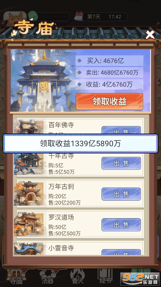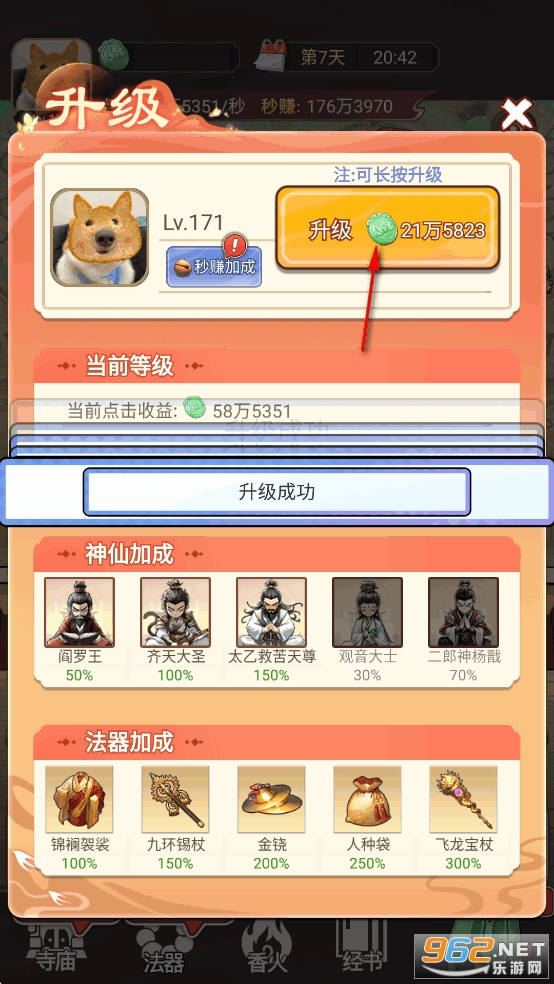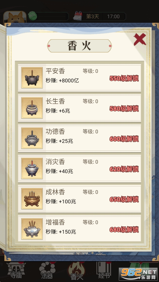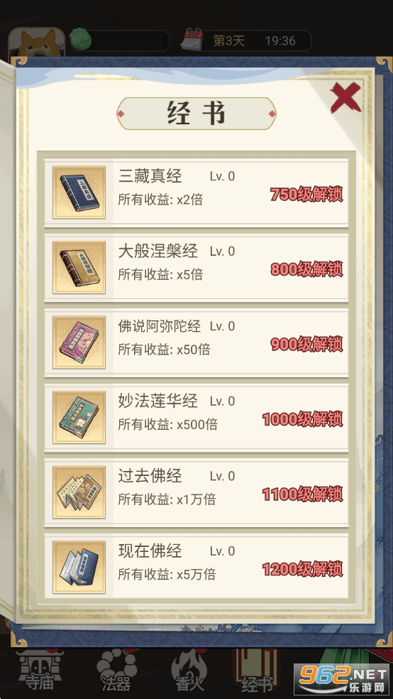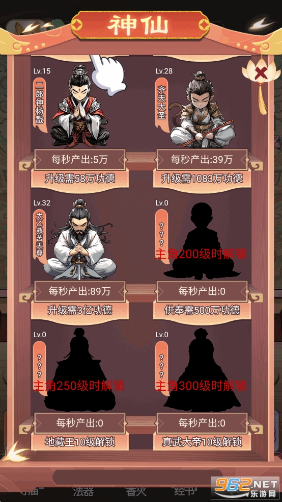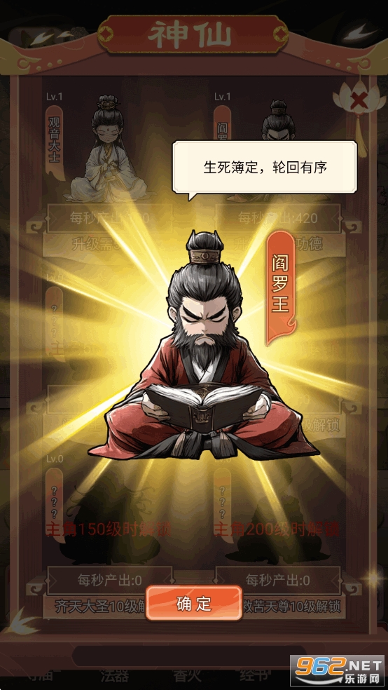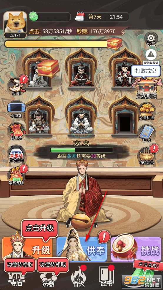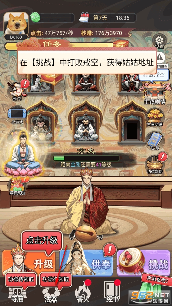 这是一个点击放置类+剧情闯关的游戏。玩家通过主线剧情需要不断的敲击木鱼获取功德值,而功德值也可以帮助玩家角色不断的进阶,从小沙弥到佛祖。