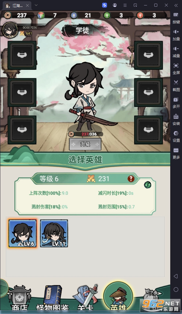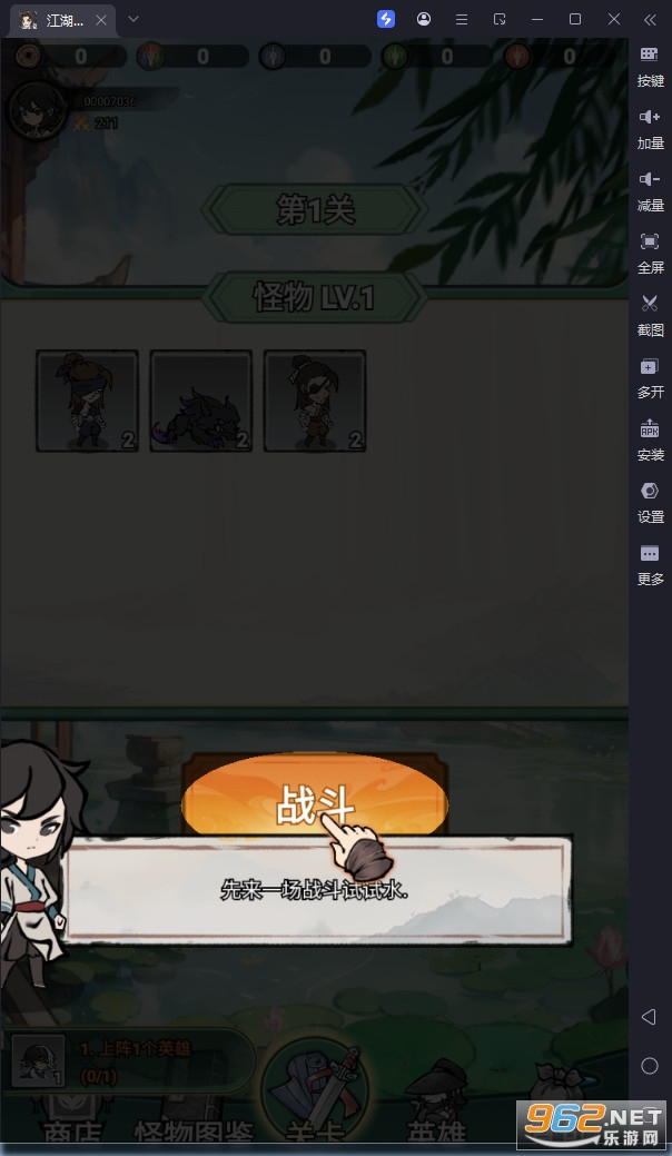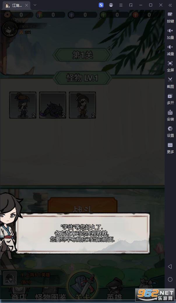 武侠挂机塔防游戏,包含:挂机战斗、英雄养成、修炼秘籍、怪物图鉴等功能。