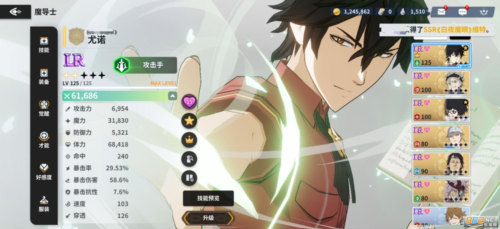 尤诺(风属性,副C / 控制):登录即可获取的 SSR,"绝对沉默" 技能能打断 BOSS 关键技能,"疾风的白弓" 可降低敌方群体防御,是前期控制链核心,魔法书搭配风之加护后行动频率大幅提升。