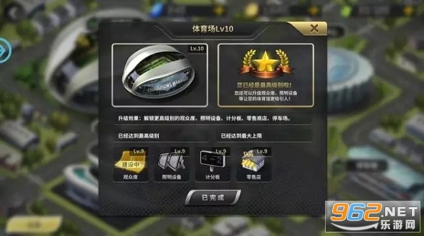 体育场内还设置有观众席、照明设备、计分板和零售店四项,每一项升级之后都能提升联赛的主场收入,虽然在升级过程中也要花费欧元,但是带来的收入提升效果可是永久的,一劳永逸哦~