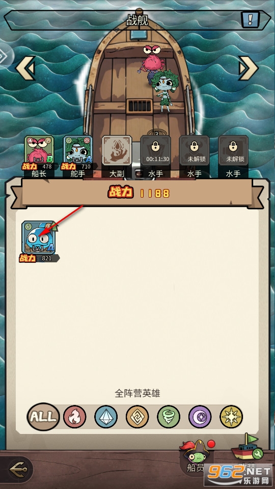 在捕获船员以后点击下方船员可以看到船只战力信息和船员信息,在解锁船员位的情况下可以选择船员上阵增加战力
