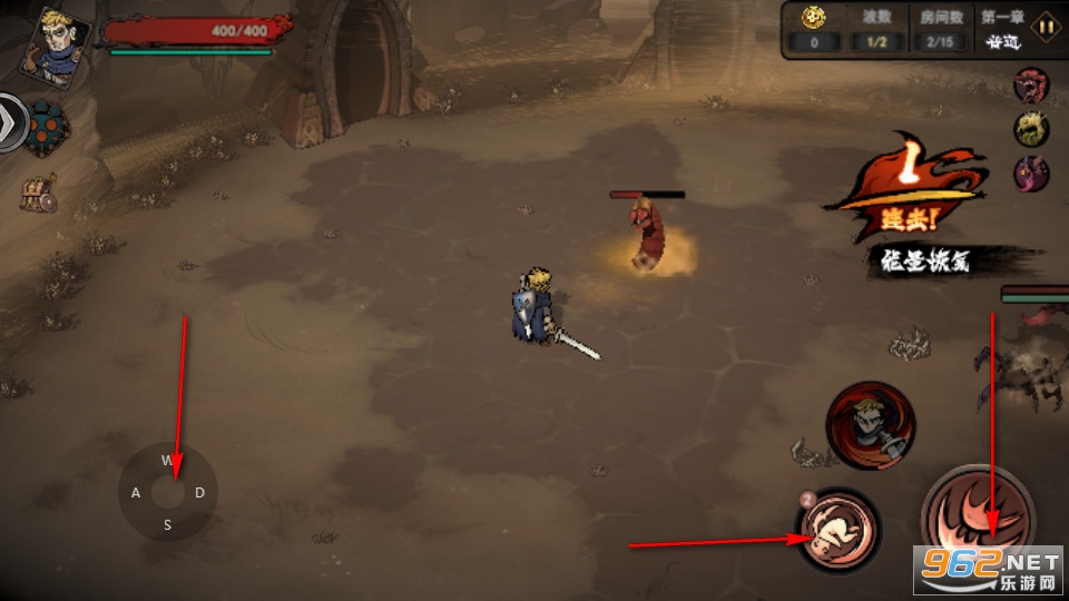 然后玩家可以在左下方实用轮盘移动,在右边有闪避键、技能键和攻击键可以使用。