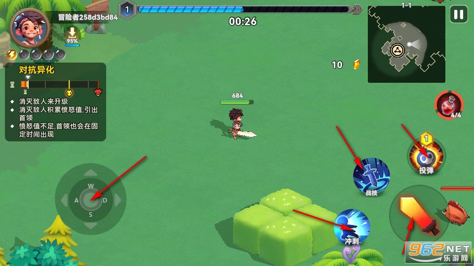 玩家在游戏中探索时需要不断的探索地图并刷宝打怪。左边可以操作遥感进行移动,右边角色可以冲刺,使用大范围攻击技能和普通攻击。