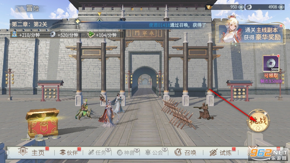 然后我们在冒险主页点击挑战,冒险主页也可以放置获得游戏角色养成资源。