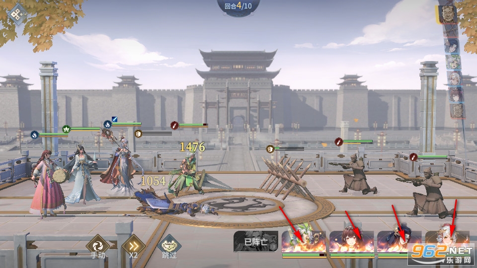 进入战斗以后我们可以选择自动托管战斗也可以选择自行战斗,角色状态栏绿色的显示当前角色的血量,黄色的条满了则是说明角色可以使用大招,点击满黄条冒火的角色即可释放技能大招。