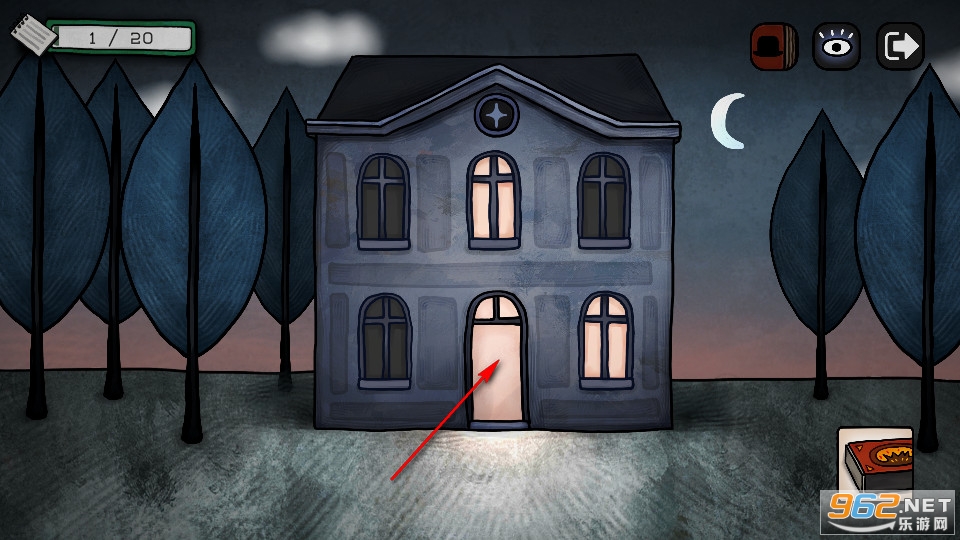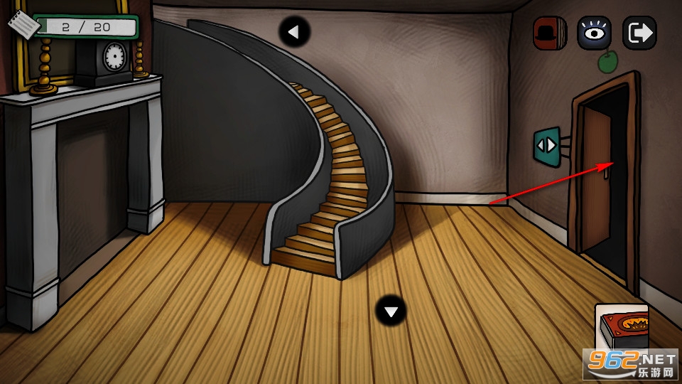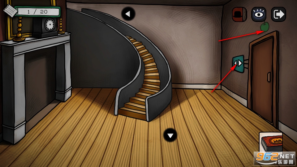 然后我们能看到右侧有一个房间,上面显示一个青苹果和一个可以解谜的按键,我们上楼寻找有关青苹果的线索。