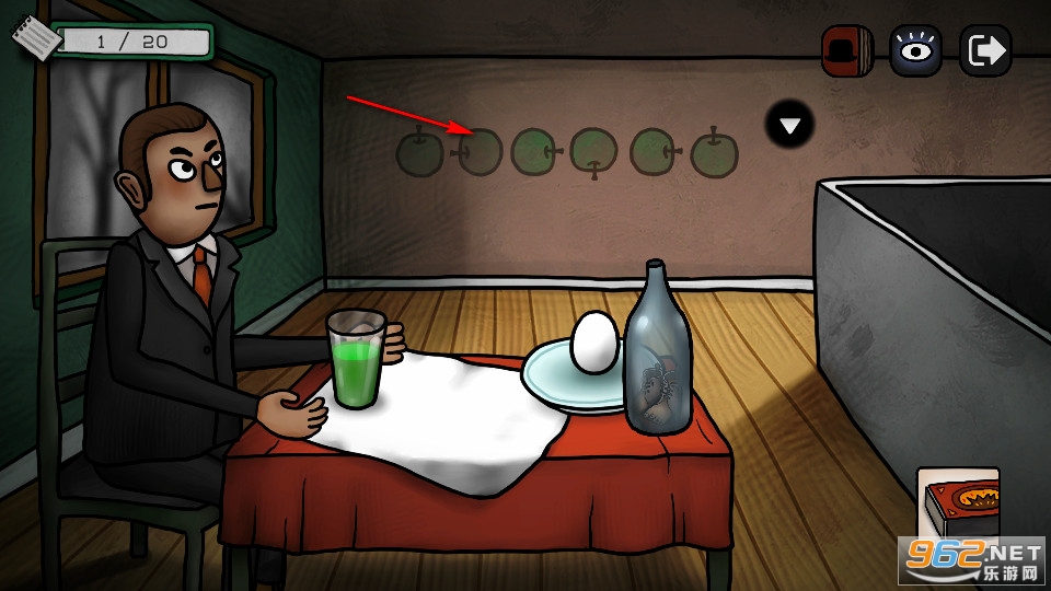 然后我们上楼,会发现一个人,点击他他会和你交流提供解谜线索,但是我们需要的是寻找青苹果有关的线索,那么后面的墙上的青苹果朝向可能就是解开楼下那扇青苹果门的重要线索。