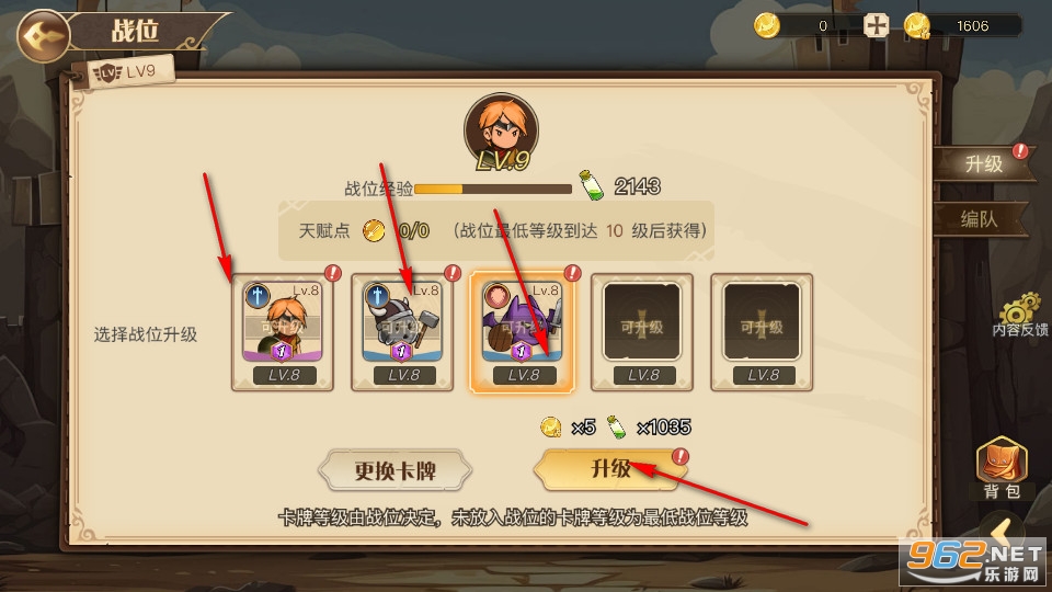 选择想要升级的英雄,能够一键对出战队伍进行升级。