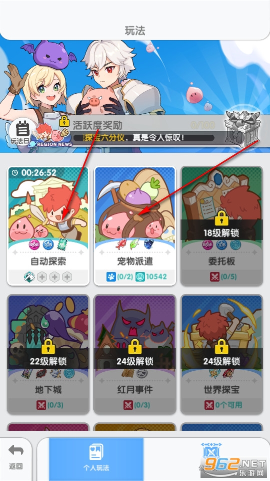 玩法中有很多挂机放置还有挑战玩法,我们可以选择派遣宠物获取资源,也可以选择自由自动探索刷怪获取资源。