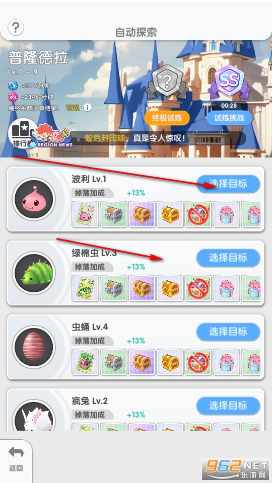 玩家可通过地区探索的试炼来加强该地区某些目标的掉落加成,这样在我们挂机打怪时就能够获得更多的资源。