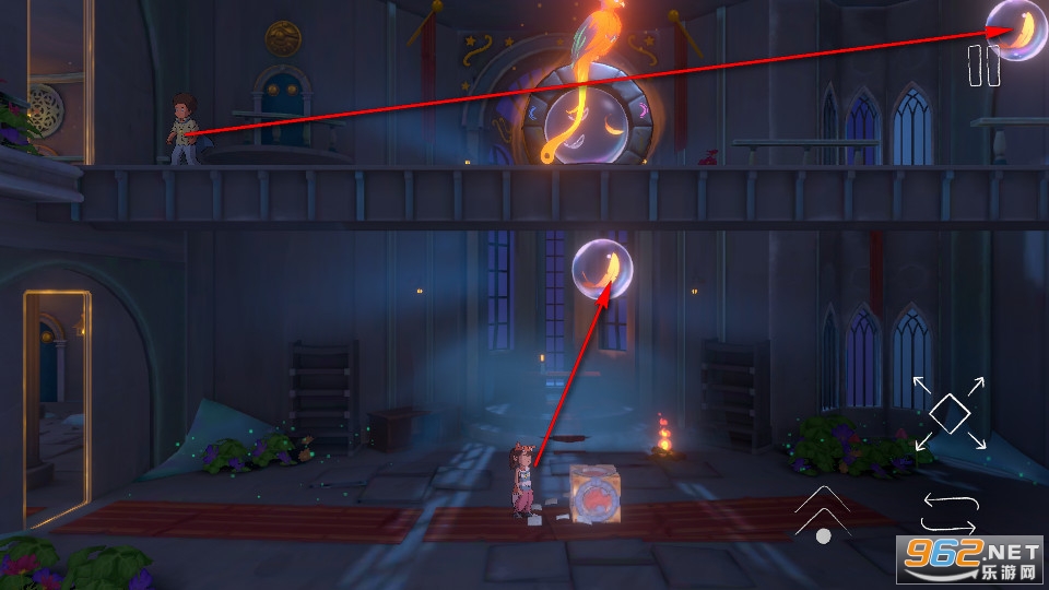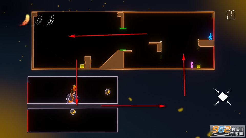 下方的角色需要推动箱子到羽毛下方,拾取到羽毛后便可推着箱子到绳子底下垫脚爬上绳子,拾取完上层的羽毛后便可成功通关。