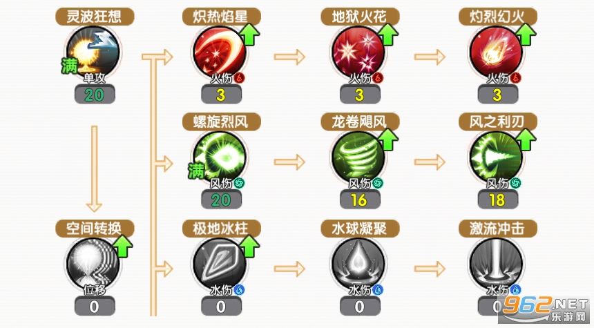 这套技能组合能高效利用冷却时间,实战中以烈焰幻火起手,可降低目标20%以上的风属性抗性,后续衔接风系主攻技能,相当于直接提升约20%的风元素伤害。选择风系作为核心,主要是因为其吟唱时间短、输出效率高。炽热焰星、地狱火花在此体系中更多作为补充,可根据需要替换为“水1”或“土1”技能,尤其在PK环境下更推荐替换使用。