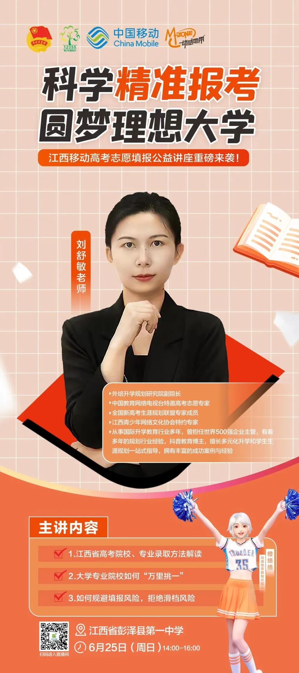 俗话说“七分成绩定,三分志愿拼”,志愿的重要性不言而喻。2023年高考已经结束,为了让广大考生及家长充分了解高考招生政策、志愿填报和录取规则,使学子们更准确、更有效地填报好志愿,圆梦高考,2023年6月25日,江西移动联合共青团江西省委、江西省(南昌市)12355青少年服务台走进江西省彭泽县第一中学,开展《科学精准报考 圆梦理想大学》高考志愿填报公益讲座活动。讲座将邀请省内高考志愿填报专家解读2023年高考志愿填报政策,解答困扰考生及家长的志愿填报问题,助力考生和家长们科学精准报考。