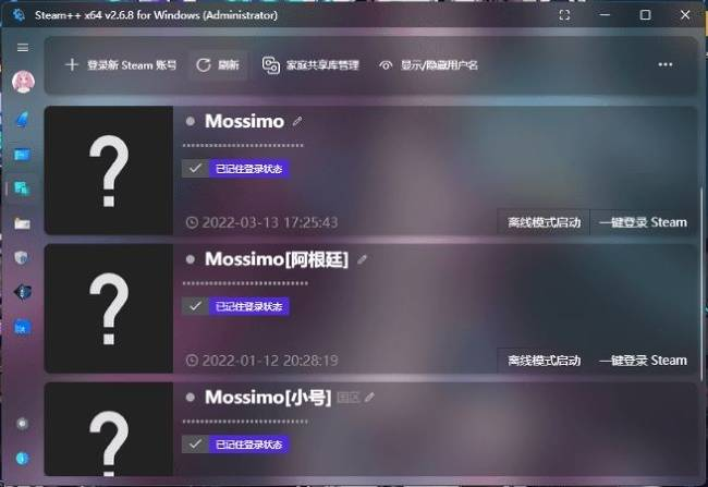 ❐ 一键切换已在当前 PC 上登录过的 Steam 账号,与管理家庭共享库排序等功能。