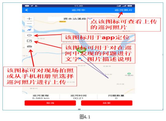 4. 巡河过程中,可点击页面中的相关图标开展巡河,如:定位、问题反馈、巡河照片上传、查看巡河照片等。