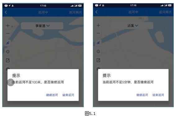5. 巡河快结束时,点击“结束”图标结束本次巡河,对行程要求是100米以上,对时间要求是5分钟以上,没有达到要求的将会被视为无效巡河,不会保存巡河记录。