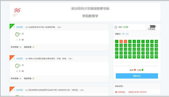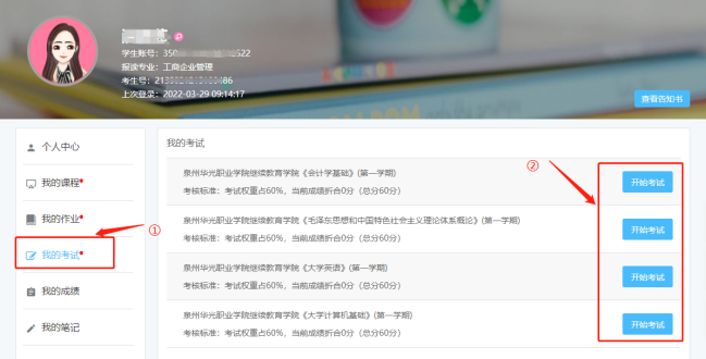 (1)进入我的考试→开始考试,可进行考试并查看试卷成绩。