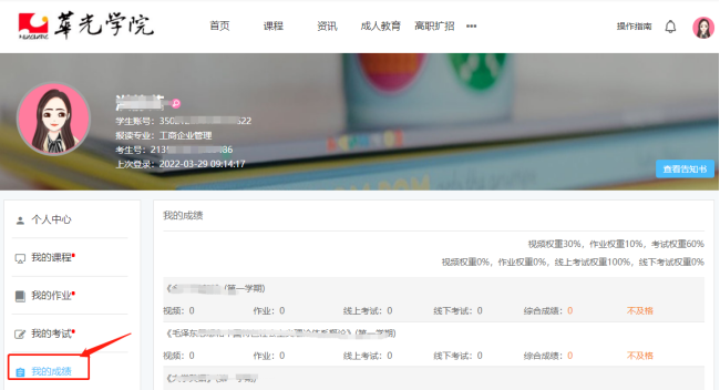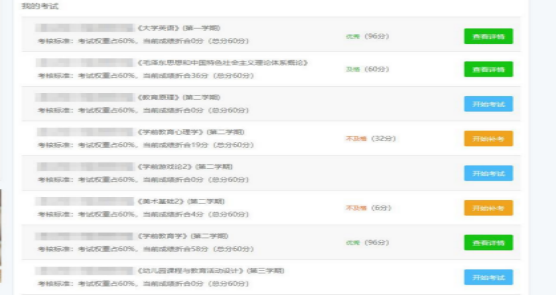 (2)进入我的考试→可查看试卷成绩,考试不及格可以补考。