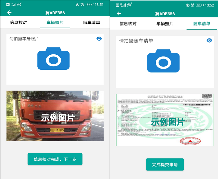 (三)新增页通过手机号码与验证码验证登录,按照提示上传相应照片、证件、环保随车清单,核对信息预览提交。
