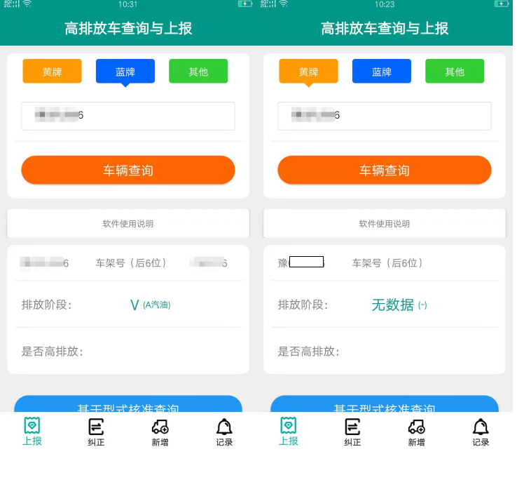 二、操作流程(一)查询页通过车牌颜色、号牌号码,查询车辆排放阶段。若排放信息有误时,点击“纠正”;排放信息显示无数据,点击“新增”。