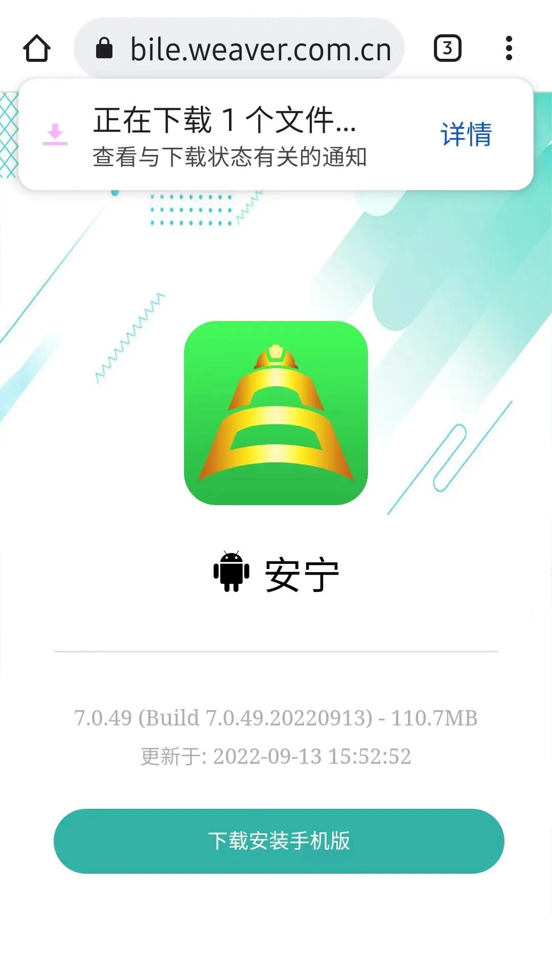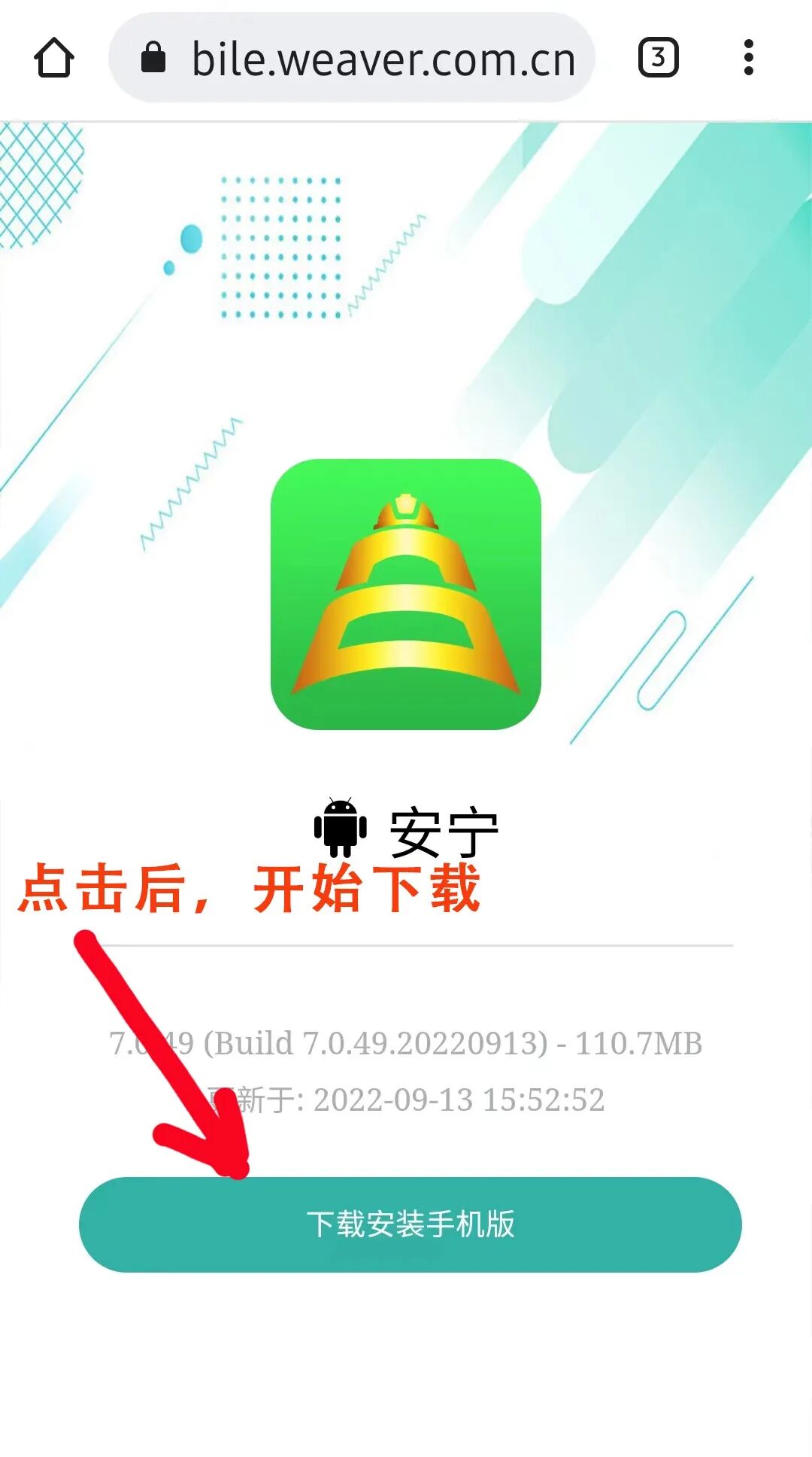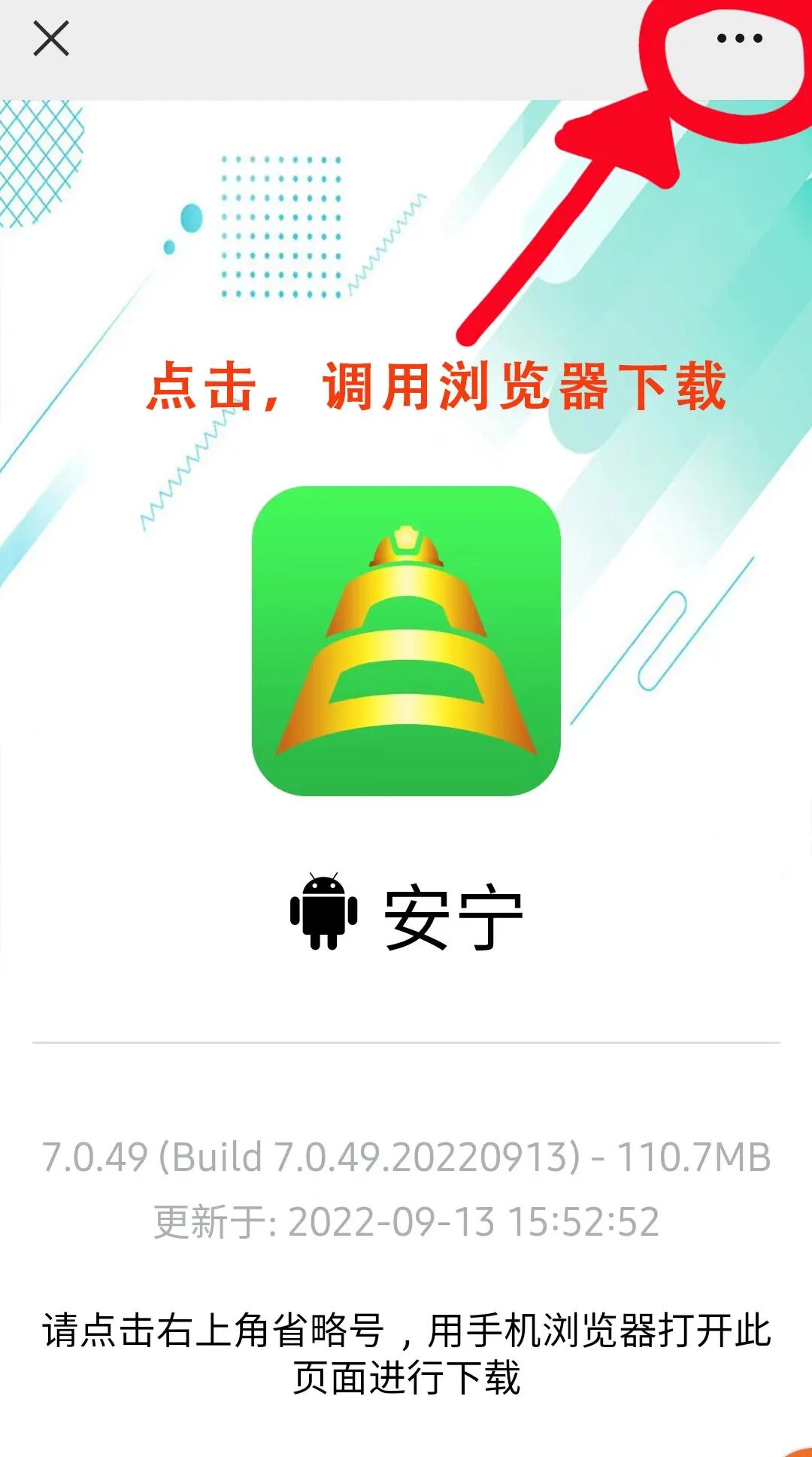 这是微信内的下载界面,微信禁止下载第三方应用。所以需要调用系统浏览器下载应用。点击右上角的三个点,打开调用界面。