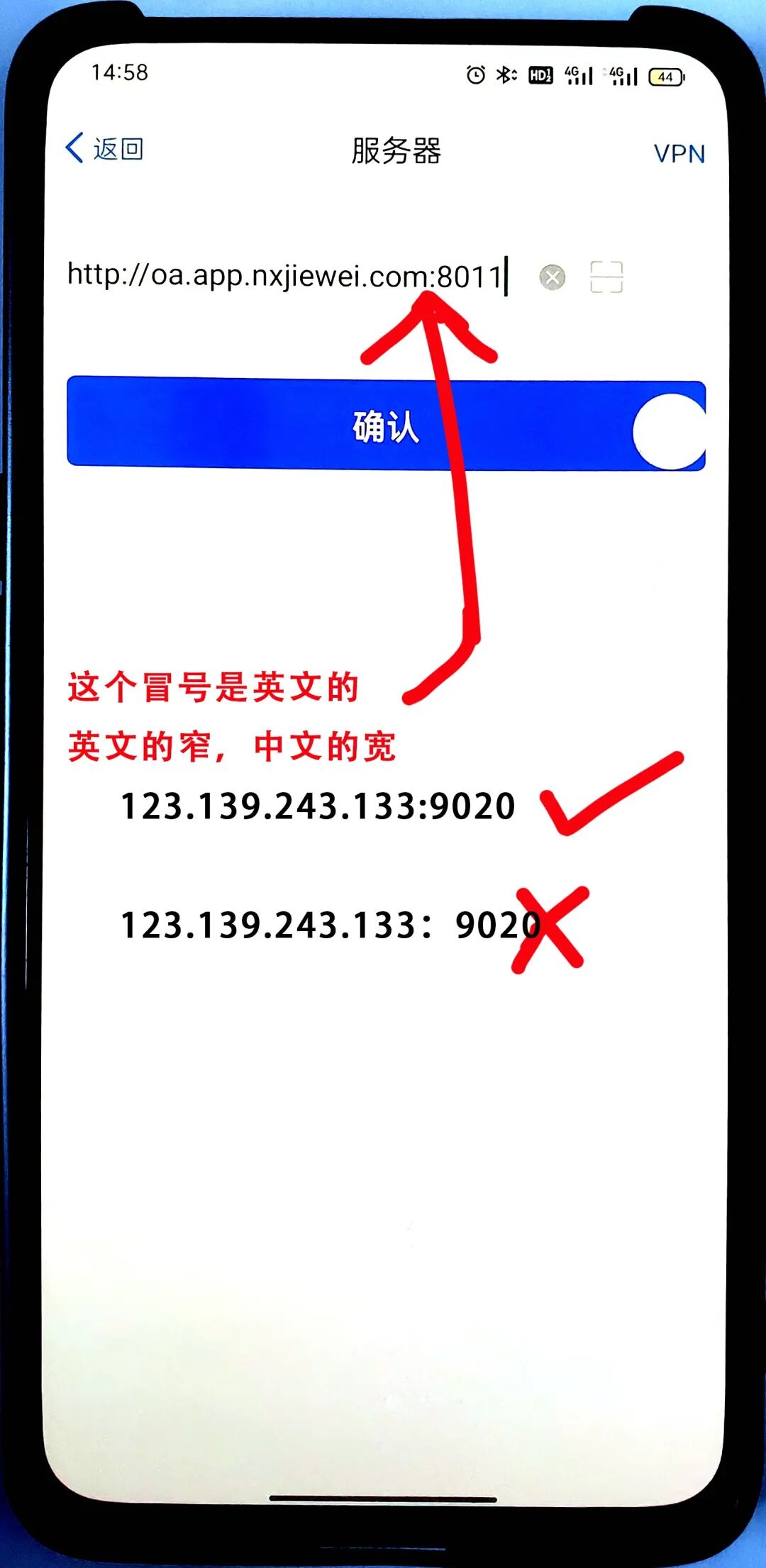 123.139.243.133:9020oa.app.nxjiewei.com:8011注意冒号必须是英文的,可通过左右间距分辨。