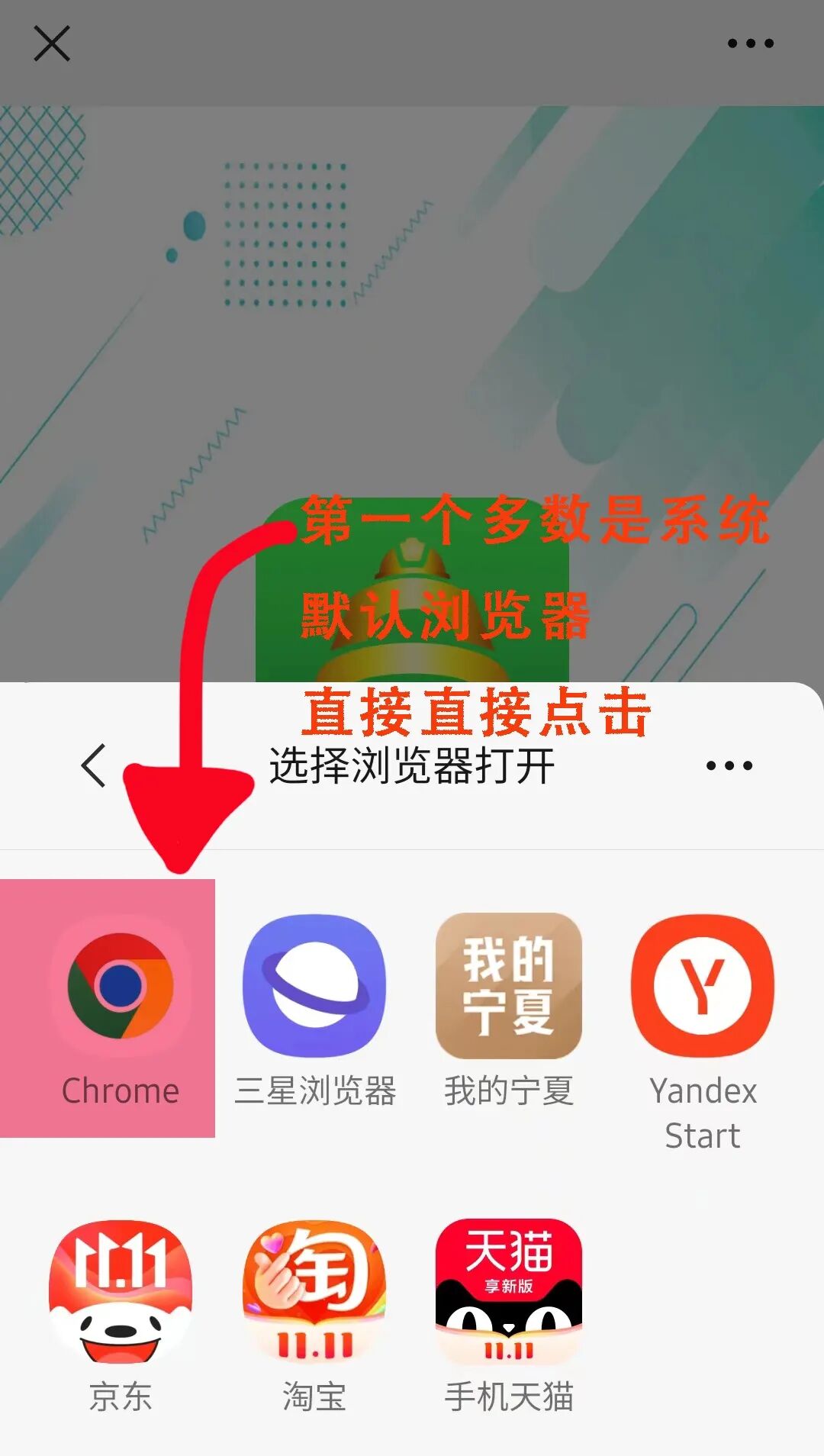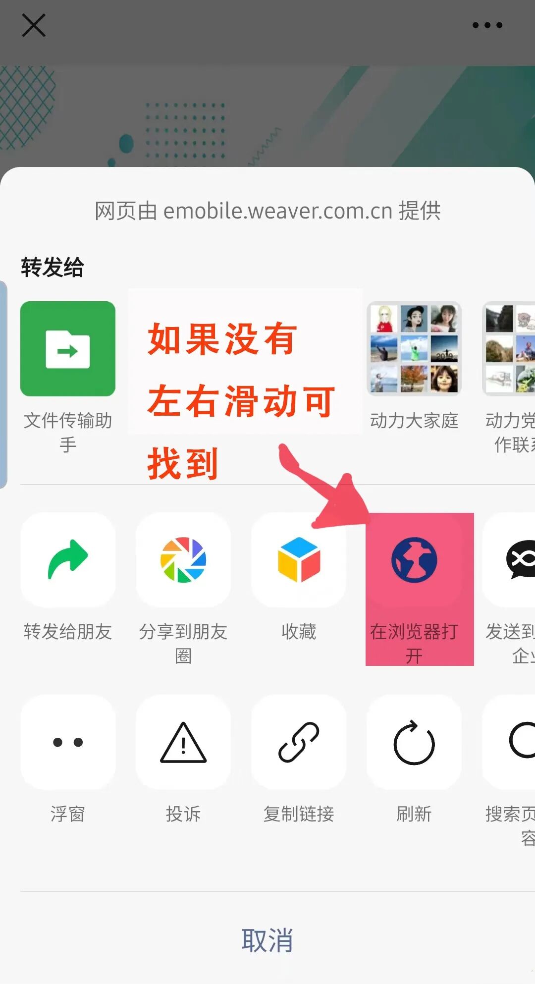 选择“在浏览器打开”。部分手机该选项在靠后位置,需要向左滑动后才能找到;