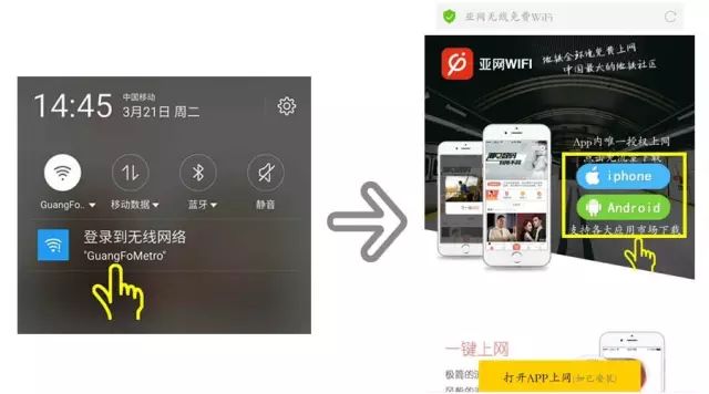 在广佛地铁打开手机WLAN,连接“GuangFoMetro”, 等待弹出APP下载页面(部分手机若无法弹出,请打开手机浏览器,进入任意网址后等待加载),在页面内点击“下载APP”即可下载。
