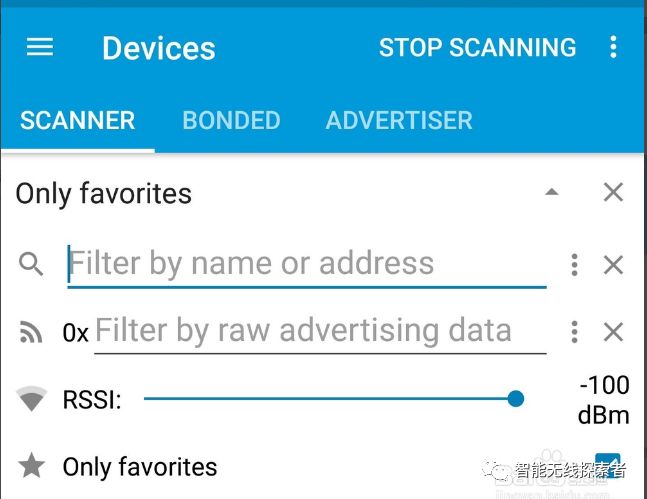 默认情况下是 “No filter”的。点击“No filter”最右边的箭头图标,可以打开过滤条件选项界面(如图:过滤扫描出的低功耗蓝牙设备)。
