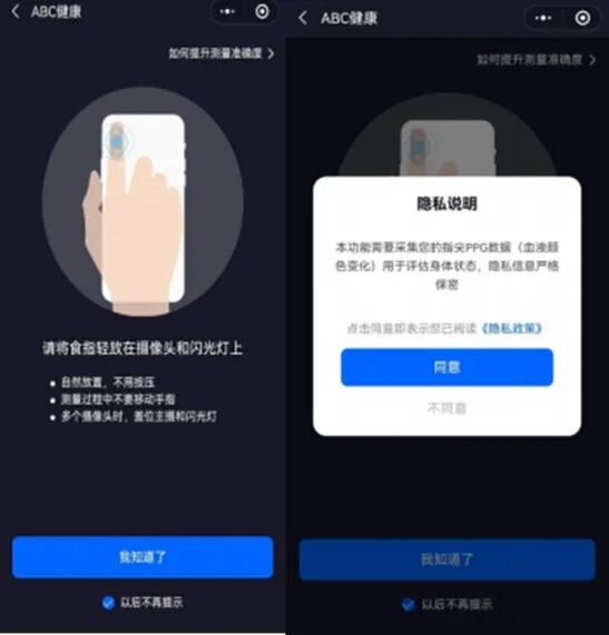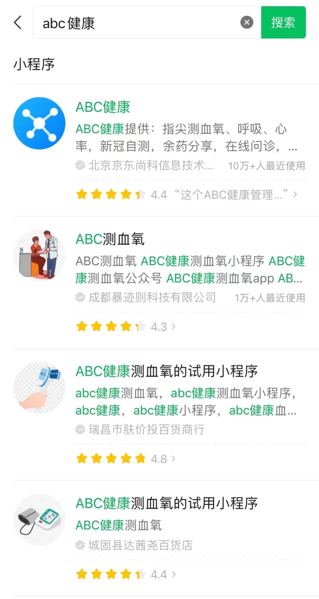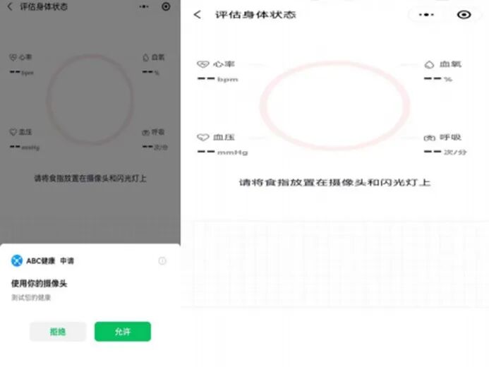abc健康小程序是准确安全可信的。因为abc健康小程序是经过微信小程序平台进行检测过的。所以是准确,安全,可信的。abc健康真能评估身体,手机摄像头可以测血氧可能会有偏差但是不大,手指放在摄像头上,可以检测血氧,体温,心率等指标,数值指标准确。