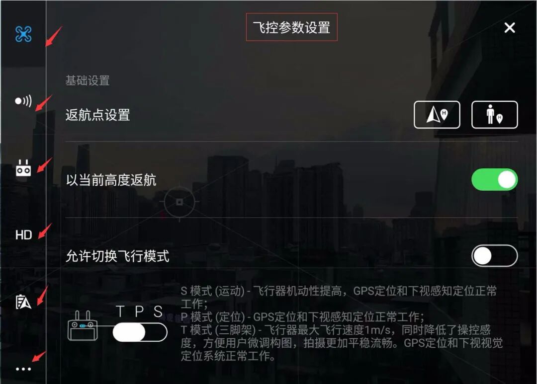 4.飞行模式:指遥控器的采用的飞行模式,例如P挡(定位模式、中速飞行、左右无避障)、T 挡(三脚架模式、低速飞行、前后左右均有避障)及S挡(运动模式、高速飞行,完全无避障功能)。