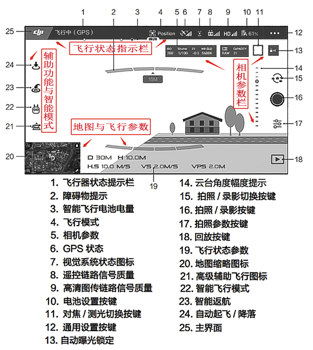 飞行界面大致可以分为4个功能分区,分别为:“飞行状态指示”“相机参数设置”“飞行参数与地图”“辅助功能与智能模式”。只有正确设置,才能在飞行和拍摄过程中得心应手,确保在飞行安全的情况下获得满意的照片和视频。