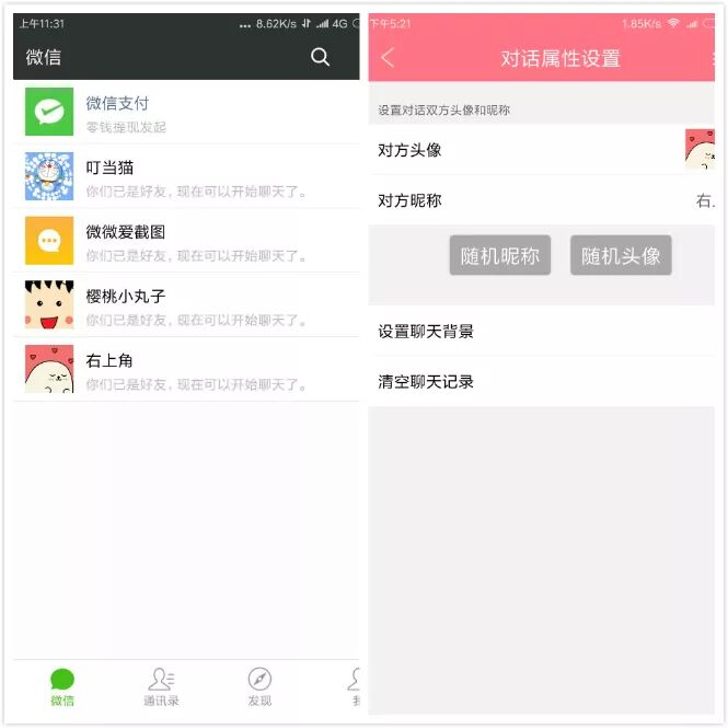 我们点击进入“微信聊天”功能;这里我们可以自由设置微信头像、对方昵称、聊天背景等;