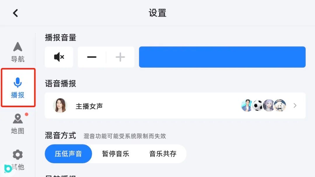 2、地图播报无声音/声音太小或是导航时无法与音乐更好的兼容首先,进入地图的设置界面,连续点击“播报”按钮10次,即可打开声音调试界面。