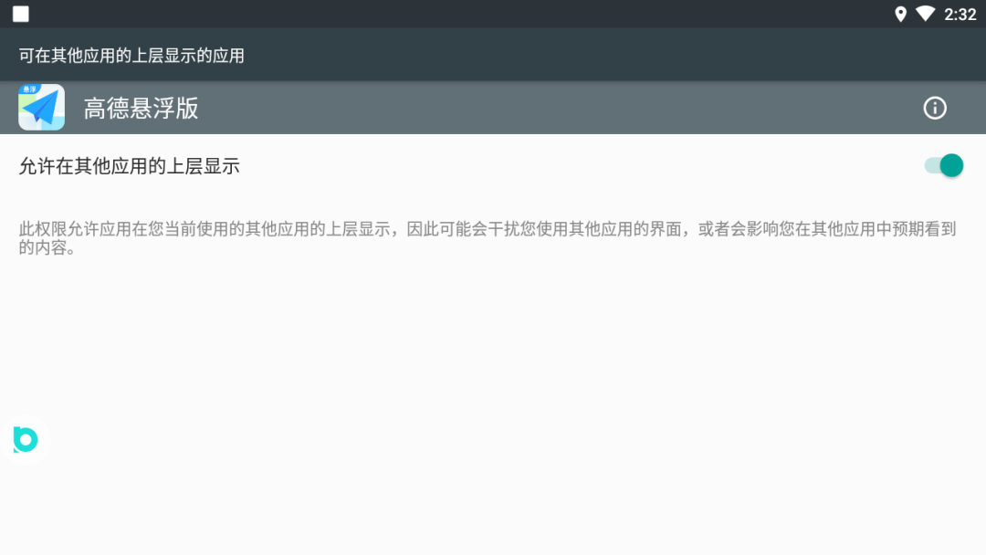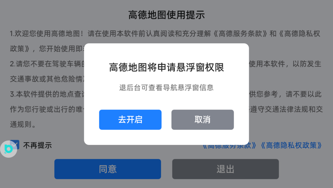 下载完成后点击进入,此时会有一个申请悬浮窗权限,这里一定要点击【去开启】,很多用户反馈说在打开高德,返回布丁桌面后,点击画中画插件按钮仍然没有画中画就是因为这个悬浮窗权限未开启哦!