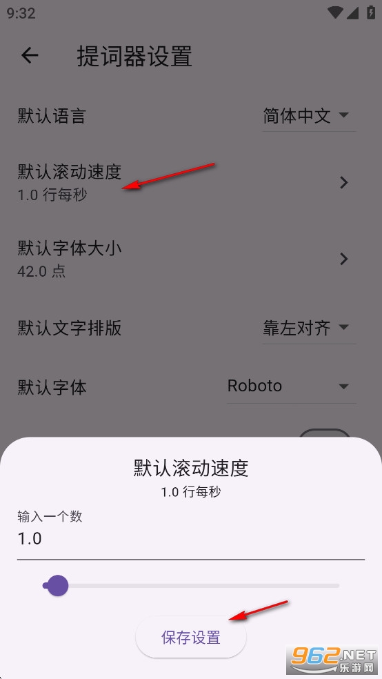 点击【默认滚动速度】调节速度后点击【保存设置】;