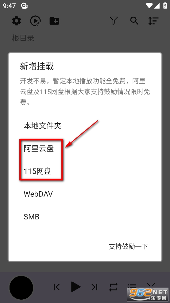 如果想要播放阿里云盘或者115网盘中的视频,就点击如果文件夹按钮,再选择阿里云盘或者115网盘(需要登录账号),然后选择视频去播放;