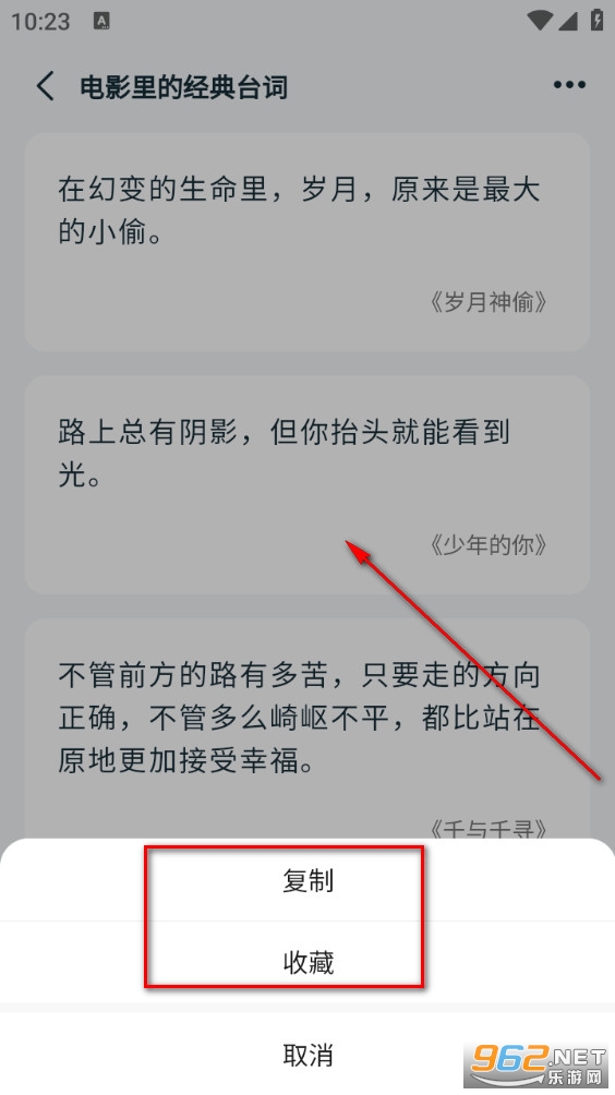 点击喜欢的句子,即可弹出复制和收藏选项。
