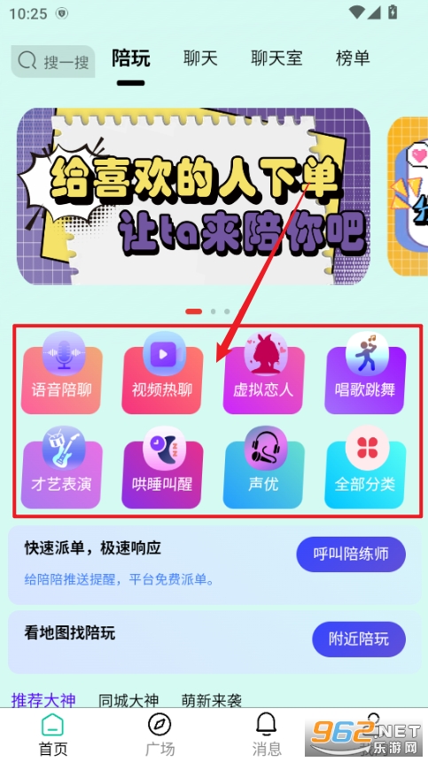 1、进入软件后,可以看到有语音陪聊、视频热聊等多板块,根据需求选择即可