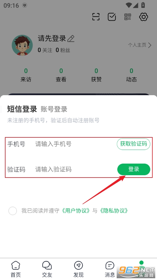 2、输入手机号验证码登录即可